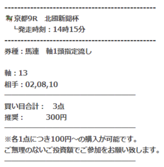 無料予想はガチガチが多いから、丸乗りするだけだと満足いかないかも。馬単にしたり、3連単にアレンジするようにして回収率は上がったからおすすめ。