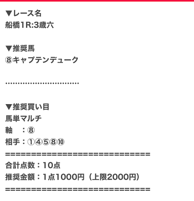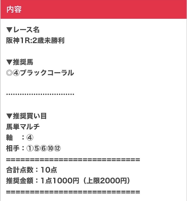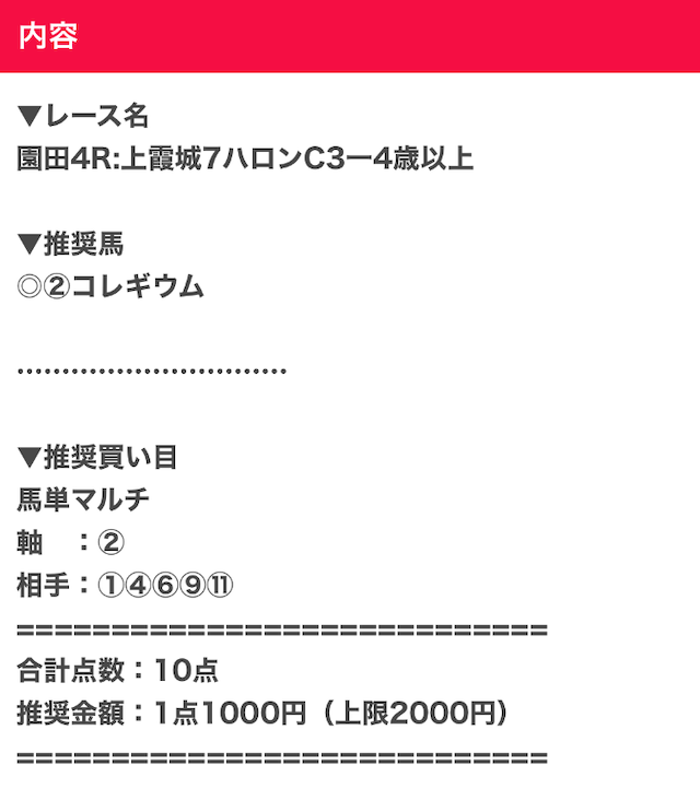 | プラン名 | 情報料金 | 公開数/券種 (馬券代) |
