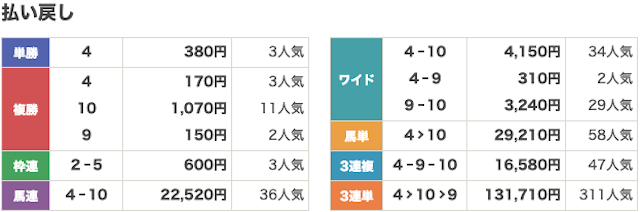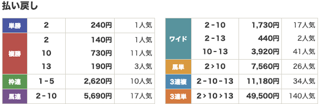 1番人気は狙い通り1着となりましたが、2着に入ってきた10番人気を読めず。